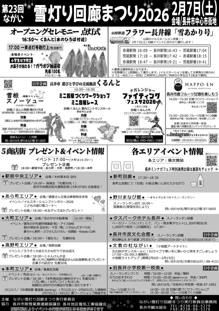 今回は、「第23回ながい雪灯り回廊まつり2026」との同時開催で特別連携企画を実施します。長井市の中心商店街をめぐって、冬の長井市を存分に楽しみましょう♪